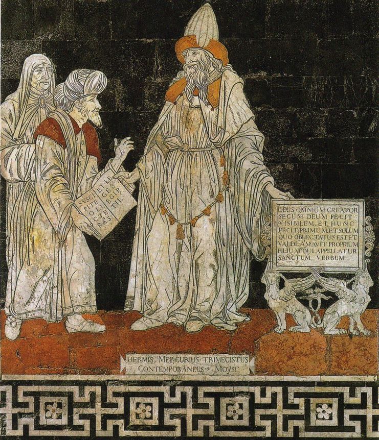 Mosaico de piso na Catedral de Siena, 1488, atribuído ao pintor italiano Stefano di Giovanni. Na legenda, sob a figura central, lê-se “Hermes Mercurius Trismegistus, contemporâneo de Moisés”. (foto: de domínio público)