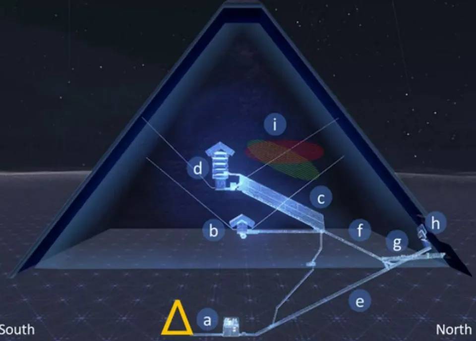 Um diagrama do projeto Scan Pyramid, com a câmara subterrânea marcada como ponto “a” (crédito da foto: PA)