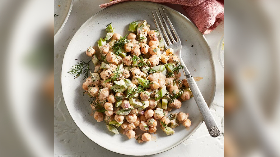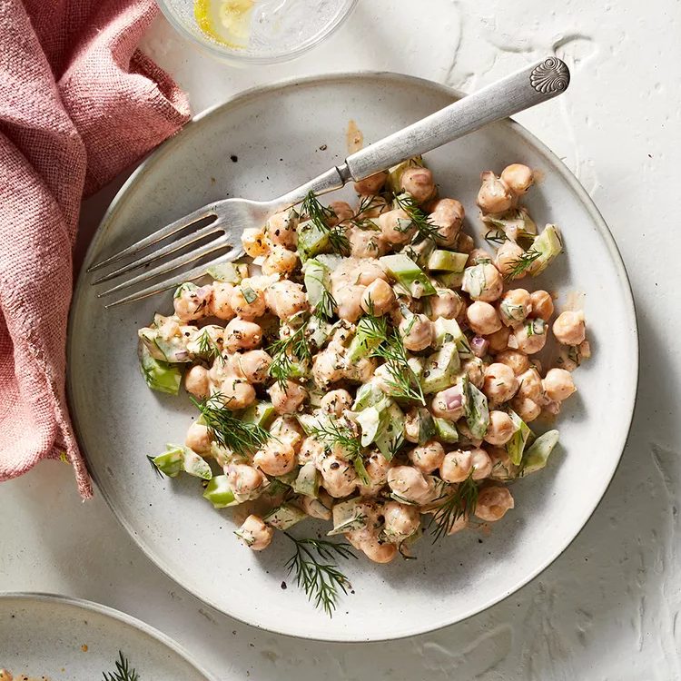 Esta salada de grão-de-bico é uma versão vegetariana da clássica salada de frango – substitui o frango por grão-de-bico. É uma receita ideal para quem busca ideias simples e saudáveis para o almoço.
