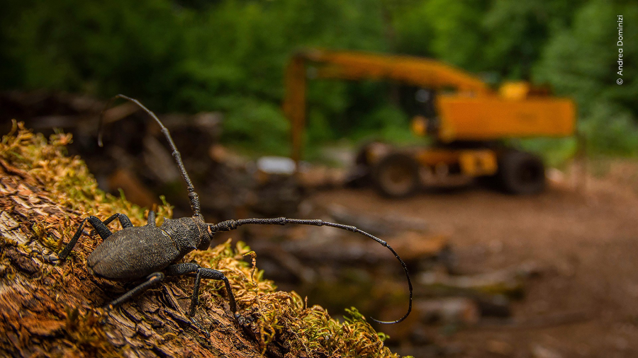 O inseto sobre um tronco cortado parece estar examinando máquinas madeireiras abandonadas nas montanhas Lepini, na Itália. O local era fonte de extração de madeira, devido às suas árvores antigas.