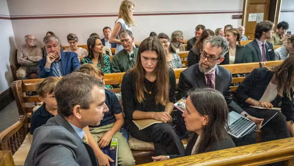 Rikki Held, a autora principal no caso de Montana, sentada no centro, conversa com a equipe jurídica antes do início do julgamento em 12 de junho de 2023. (foto: William Campbell/Getty Images)