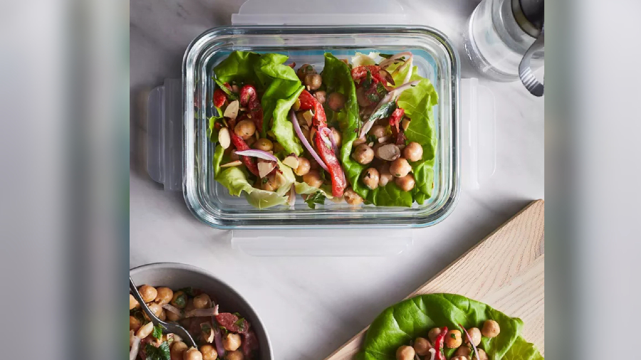 Um molho de tahine picante e com sabor de nozes combina ingredientes que não precisam ser cozidos, como grão-de-bico enlatado e pimentões vermelhos assados, para criar estes wraps de alface fáceis de preparar. Prepare-os com antecedência para um almoço ou jantar rápido. Algumas fatias de pão pita quente finalizam a refeição na perfeição.