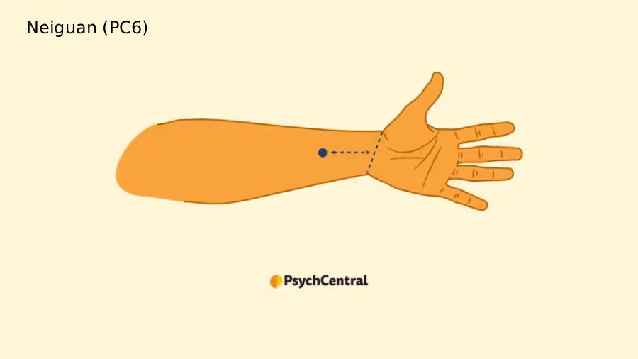 O Ponto Portal Interno (PC6) fica no braço, perto do pulso. Você pode encontrá-lo medindo três dedos a partir do pulso e localizando a cavidade entre os tendões.