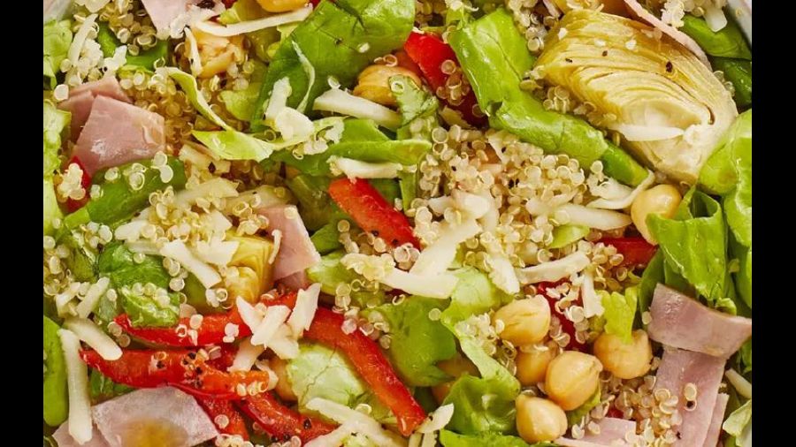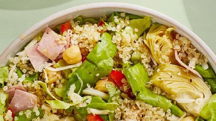 Esta versão saudável de uma salada de delicatessen combina quinoa e grão-de-bico com pequenas quantidades de presunto e mussarela, para que você tenha todo o sabor sem exagerar no sódio.