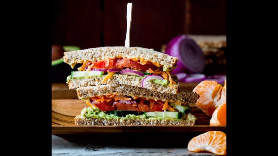 Com este sanduíche vegano de vegetais, rico em fibras e gorduras saudáveis, e acompanhado de frutas, você não corre o risco de sentir fome à tarde. Ele te manterá energizado até o jantar. Sinta-se à vontade para substituir os vegetais, brotos ou folhas verdes por outros de sua preferência.