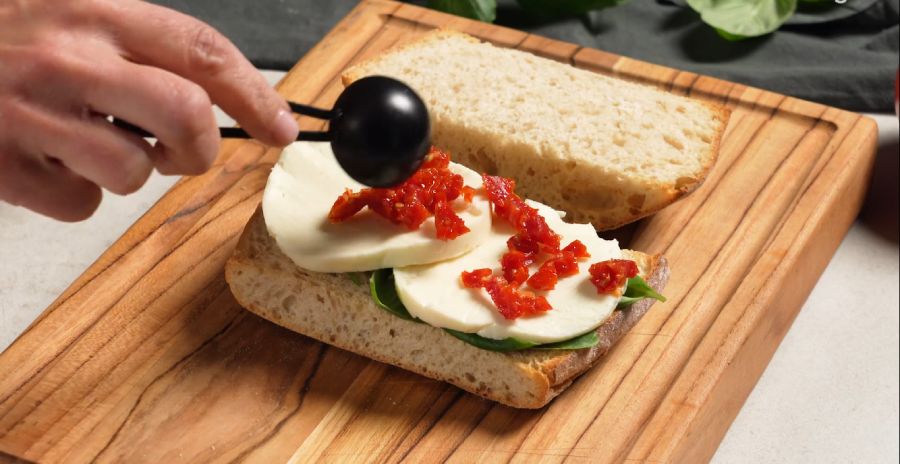 • Para um toque picante, considere adicionar 1/8 de colher de chá de pimenta vermelha moída ou pasta de pimenta calabresa ao sanduíche. Você pode misturá-la facilmente com os tomates secos, adicionando a quantidade que preferir.