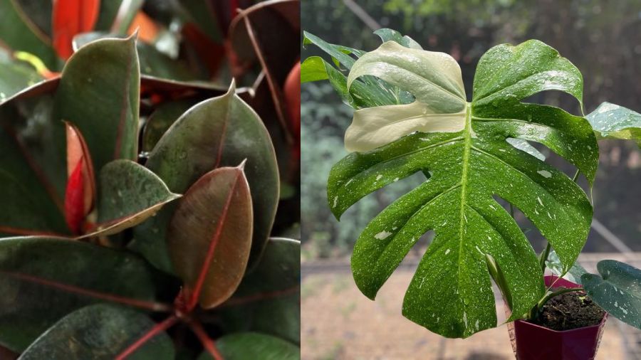 Ao escolher plantas, considere a folhagem e como elas ficam juntas. O brilho de uma Ficus elastica bordô ao lado de uma Monstera ‘Thai Constellation’, por exemplo, é impressionante.